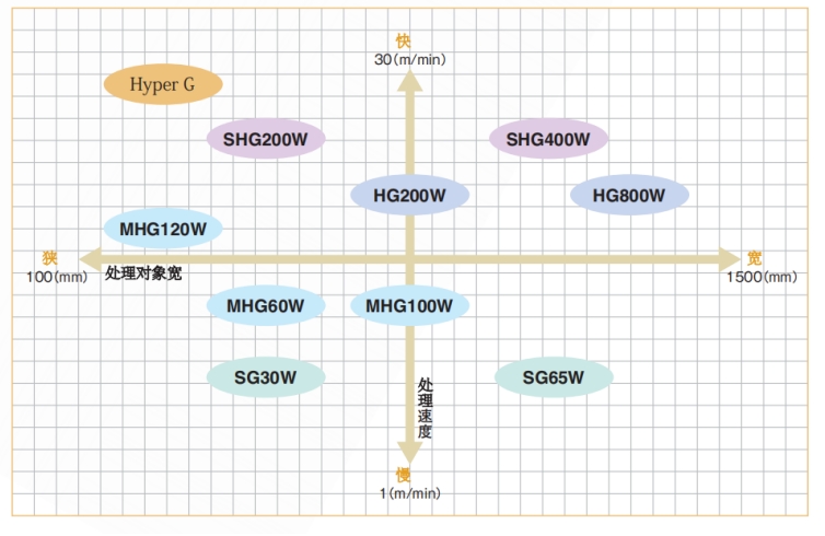 采用高壓水銀燈作為光源,可實現(xiàn)高UV照度、縮短機長及高水平殺菌。特別適用于高功率水冷式SHG型難以應對的高速處理和深形容詞等的殺菌。